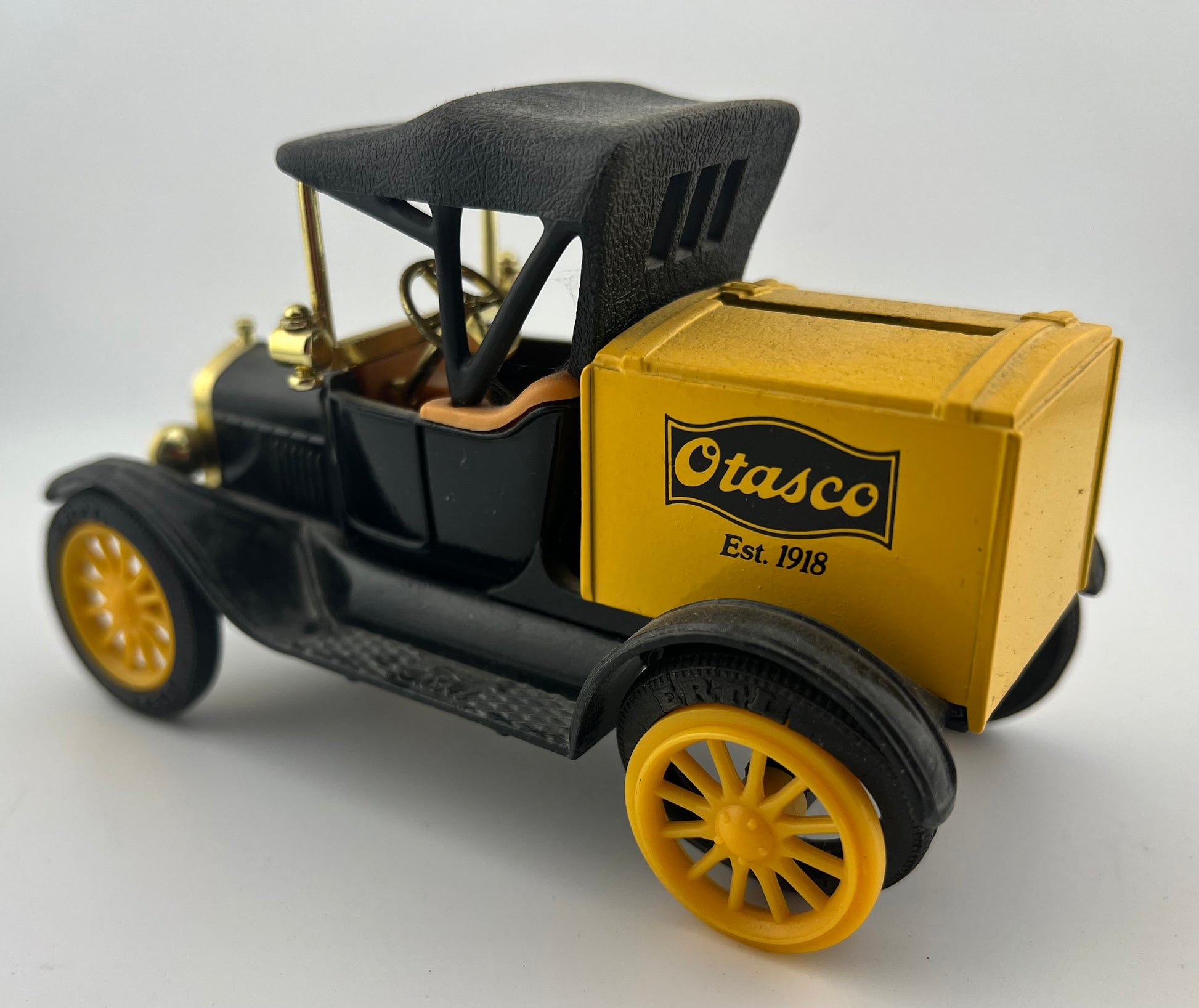 This vintage-style diecast model captures the charm of an early 20th-century delivery truck, featuring the Otasco branding established in 1918. Finished in a striking black and yellow color scheme, this classic vehicle showcases gold trim, a soft-top canopy, and spoked wheels that add to its historical appeal. The detailed interior includes a miniature steering wheel, bench seat, and brass-like accents, making it an excellent addition for collectors of antique automobiles and nostalgic advertising memorabilia.